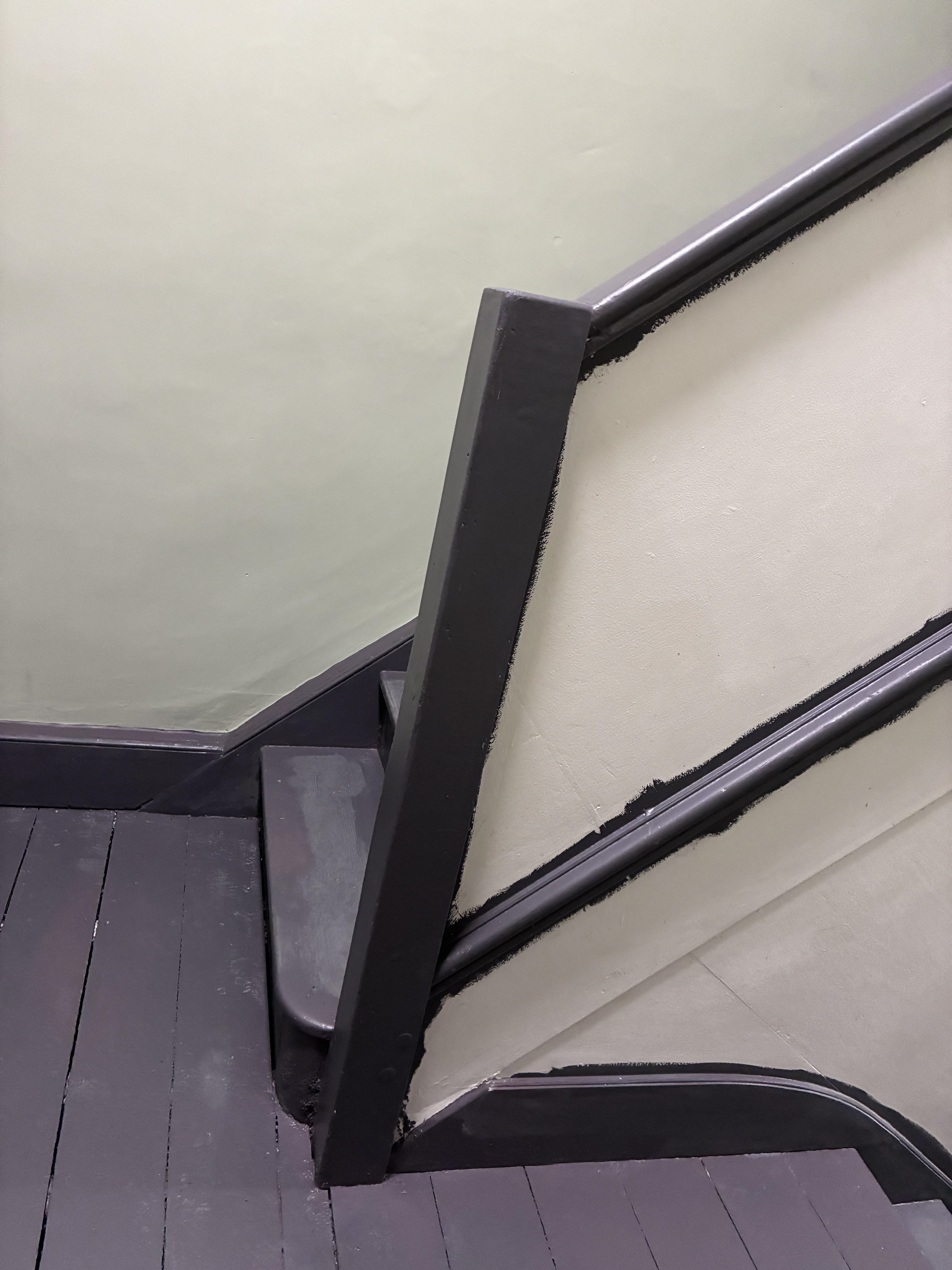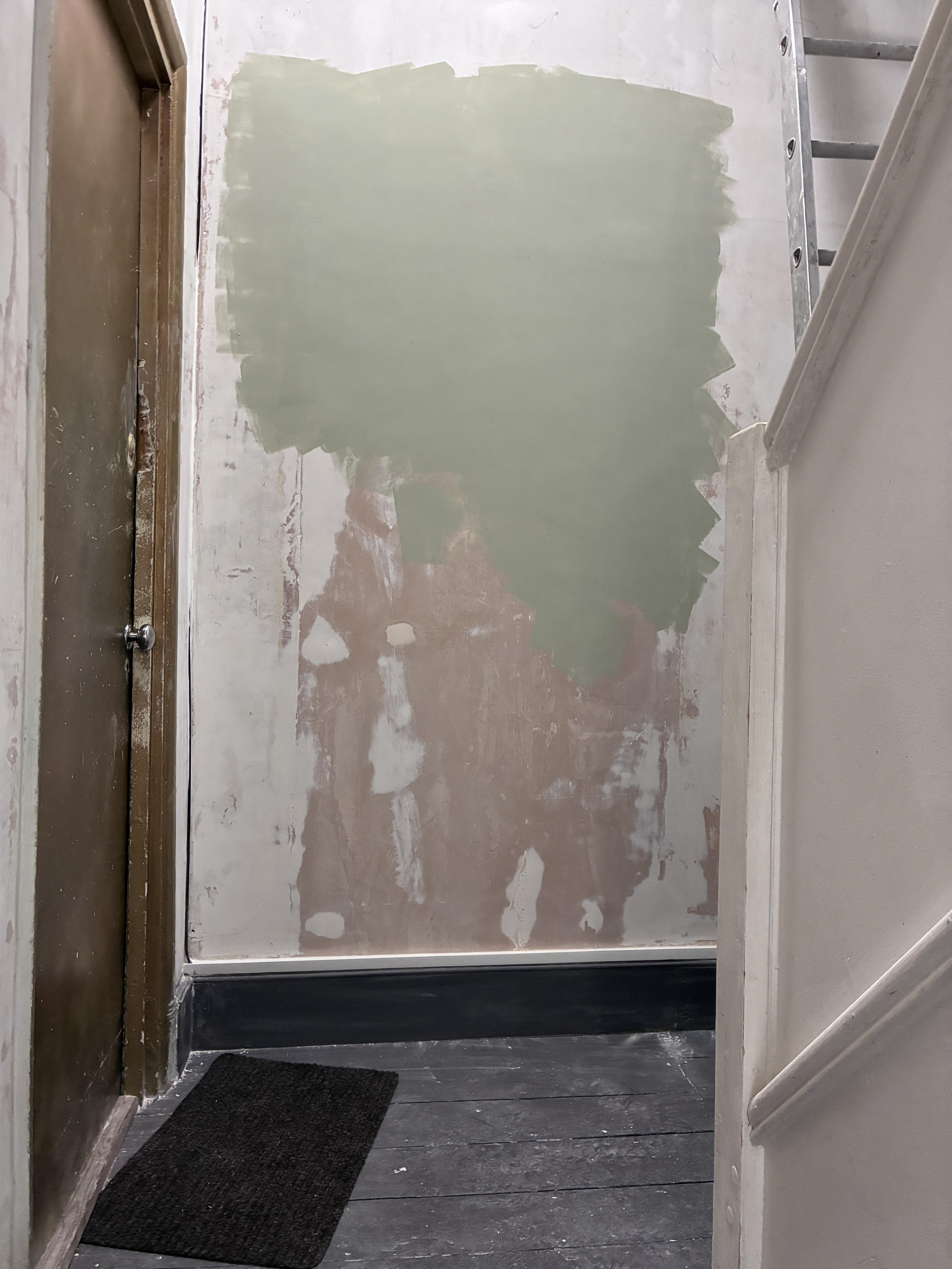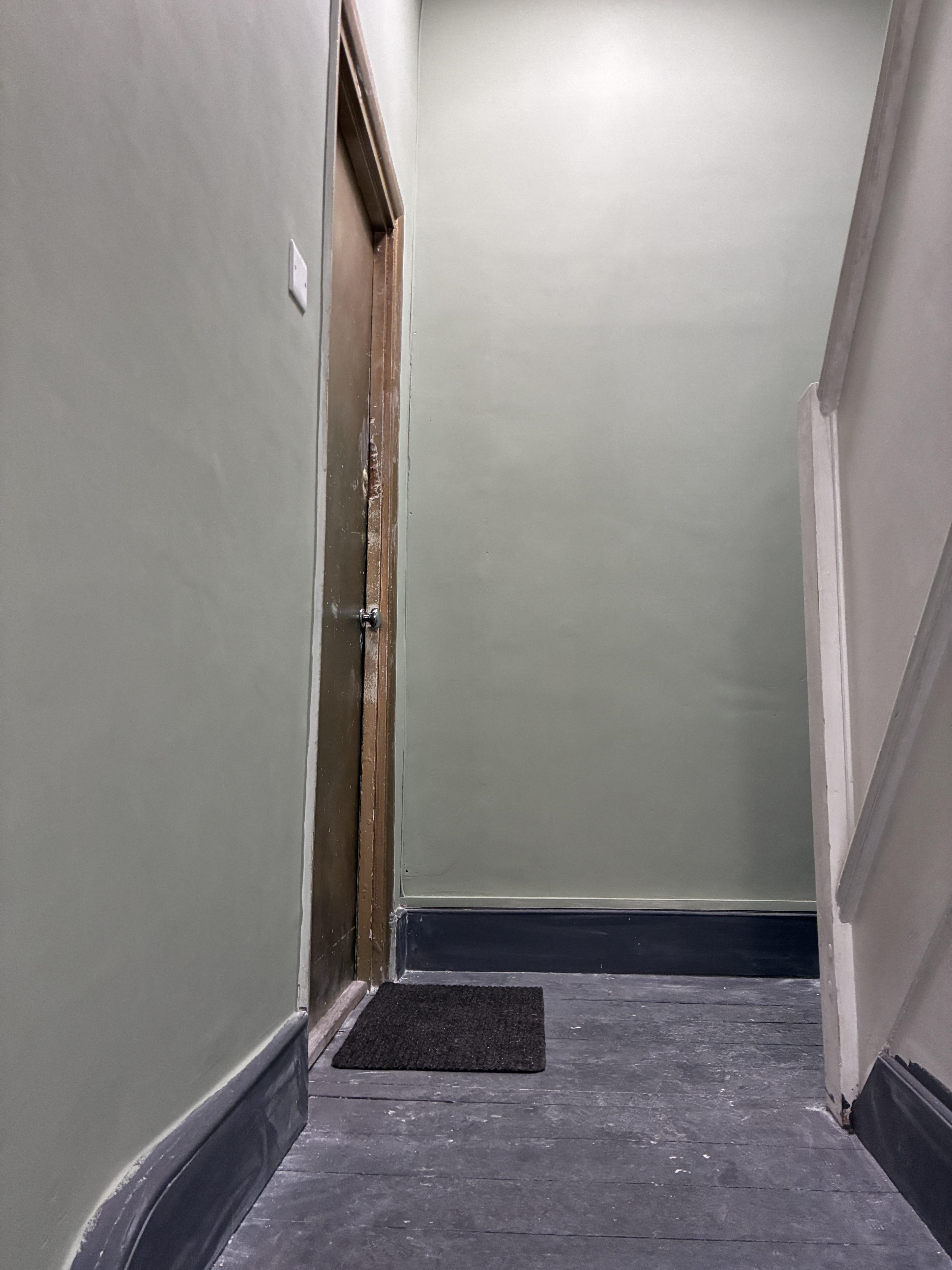 the wall of corridor finally painted with nice cow paisley green, and the floor has varnished but still a part of stair case haven't coloured.